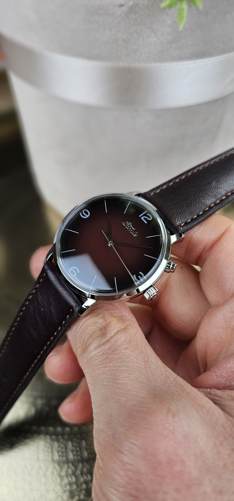 Wariant Herc wyróżnia się głęboką, bordową tarczą. To kolor o wyjątkowej intensywności, kojarzony z elegancją, pewnością siebie i luksusem. Brak datownika podkreśla czystą formę i absolutny minimalizm – nic nie zakłóca kompozycji, a zegarek prezentuje się wyjątkowo harmonijnie. Efekt podkreśla subtelna gra światła na wypukłym szafirowym szkle.