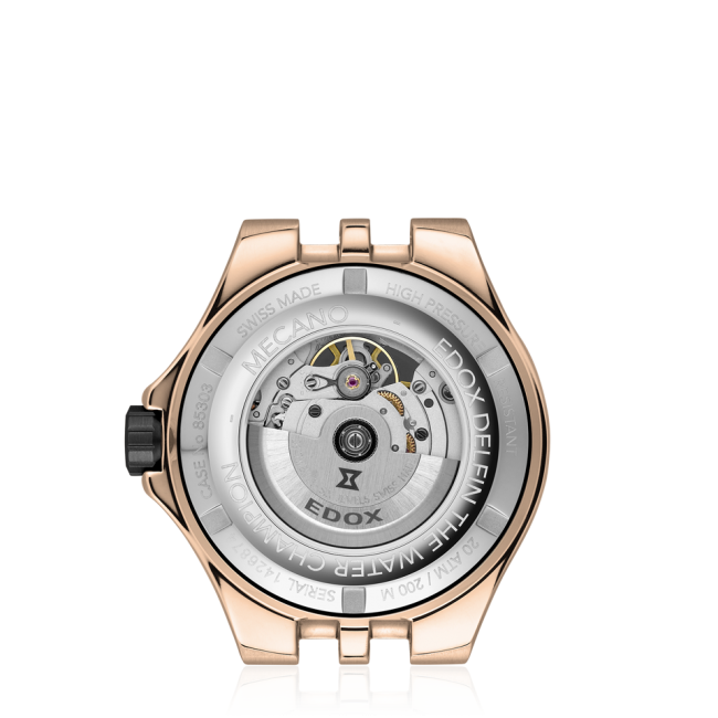 Edox Delfin Mecano Skeleton 85303-357RN-NRN to unikalne połączenie sportowej wytrzymałości legendarnej linii Delfin z ekskluzywną estetyką skeleton oraz efektownym wykończeniem Pink PVD. Model ten został stworzony dla mężczyzn, którzy oczekują od zegarka zarówno realnych parametrów nurkowych, jak i wyrazistego, luksusowego designu.