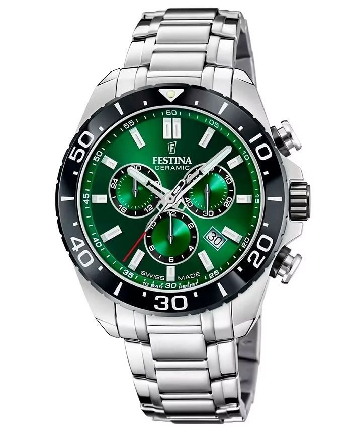 Zegarek Festina Ceramic Chrono Swiss Made F20042/3 to luksusowy męski czasomierz łączący nowoczesne wzornictwo z najwyższą precyzją Swiss Made. Wyposażony w niezawodny mechanizm kwarcowy z funkcją chronografu gwarantuje dokładny pomiar czasu i niezawodne działanie. Zielona tarcza z subtarczkami i datownikiem nadaje zegarkowi wyjątkowego, odważnego charakteru i świetnie kontrastuje ze srebrną kopertą oraz bransoletą wykonaną ze stali szlachetnej wzbogaconej elementami ceramicznymi. Szkło szafirowe chroni tarczę przed zarysowaniami, a solidna konstrukcja zapewnia trwałość i elegancję przez lata. Festina Ceramic Chrono Swiss Made F20042/3 to doskonały wybór dla mężczyzn, którzy cenią oryginalny design, funkcjonalność i prestiżowe wykończenie.