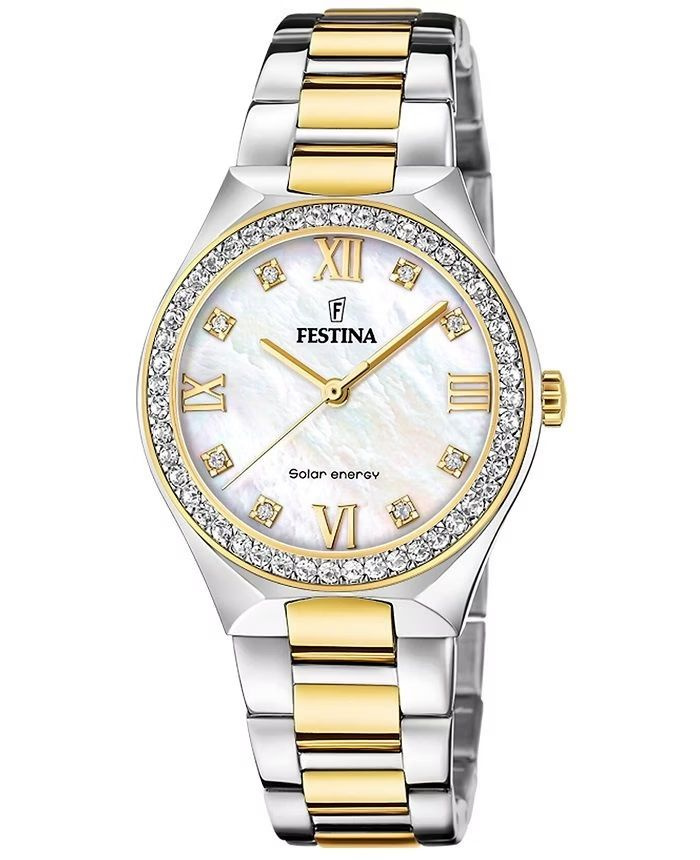 ZEGAREK FESTINA Solar Energy F20659/1 to damski zegarek o eleganckim i nowoczesnym charakterze, napędzany energią słoneczną. Model wyposażony jest w precyzyjny mechanizm Miyota Solar, który eliminuje potrzebę wymiany baterii. Okrągła koperta ze stali szlachetnej o szerokości 35 mm i grubości 9 mm harmonijnie komponuje się z dwukolorową bransoletą ze stali nierdzewnej. Tarcza w kolorze masy perłowej ozdobiona została subtelnymi kryształkami, które dodają zegarkowi blasku i kobiecej elegancji. Mineralne szkło skutecznie chroni przed zarysowaniami, a wodoszczelność na poziomie 5 ATM zapewnia bezpieczeństwo podczas codziennego użytkowania. To idealny wybór dla kobiet poszukujących połączenia ekologicznej technologii solarnej z klasycznym, biżuteryjnym stylem.