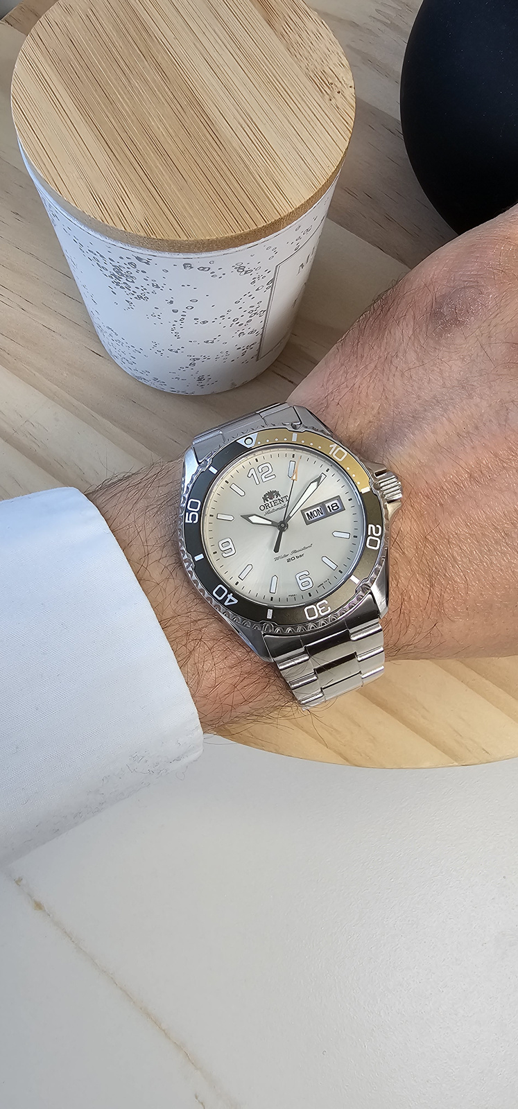 ZEGAREK ORIENT Kamasu RA-AA0821S39B z automatycznym mechanizmem i tarczą w kolorze beżowym to męski czasomierz, który tworzy idealne zestawienia zarówno z eleganckim, jak i codziennym ubiorem. Posiada wysokiej jakości bransoletę w kolorze srebrnym. Okrągła koperta w rozmiarze 42mm została została wykonana ze stali 316L, jej wysokość to 13 mm. Zegarek jest niezwykle solidny, doskonale prezentuje się na męskim nadgarstku. Całość przykryta jest szkiełkiem szafirowym . Zegarek pracuje dzięki solidnemu mechanizmowi automatycznemu Orient F6922. Zegarek jest odporny na długotrwałe przebywanie pod wodą, ponieważ posiada wodoszczelność na poziomie 200 metrów, a jego styl wskazuje aby dobierać go do klasycznego ubioru. Zegarek posiada datownik, fluorescencyjne indeksy na tarczy, fluorescencyjne wskazówki, obrotową lunetę ,powłokę PVD/DLC, wskaźnik dnia tygodnia, zakręcaną koronkę .
