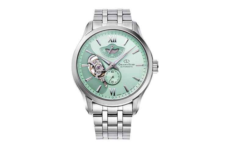ZEGAREK ORIENT STAR Contemporary Semi-Skeleton Layered RE-AV0B11E00B z automatycznym mechanizmem i tarczą w kolorze miętowym to męski czasomierz, który tworzy idealne zestawienia zarówno z eleganckim, jak i codziennym ubiorem. Posiada wysokiej jakości bransoletę w kolorze srebrnym. Okrągła koperta w rozmiarze 42mm została została wykonana ze stali 316L, jej wysokość to 12 mm. Zegarek jest niezwykle solidny, doskonale prezentuje się na męskim nadgarstku. Całość przykryta jest szkiełkiem szafirowym . Zegarek pracuje dzięki solidnemu mechanizmowi automatycznemu F6F44 . Zegarek jest odporny na długotrwałe przebywanie pod wodą, ponieważ posiada wodoszczelność na poziomie 100 metrów. Zegarek posiada open heart.