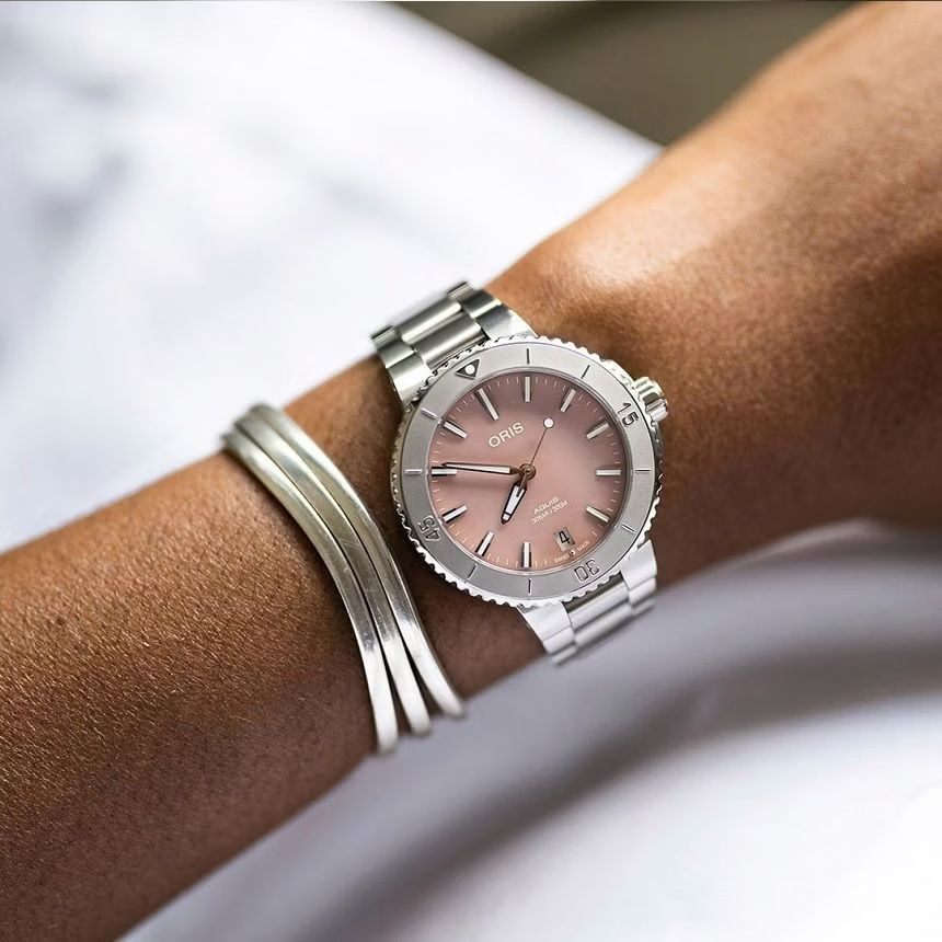ORIS Aquis Date X Bracenet Lady 01-733-7770-4158-07-8-18-05P to damski zegarek nurkowy stworzony we współpracy z organizacją Bracenet, której misją jest ochrona oceanów i przetwarzanie porzuconych sieci rybackich („ghost nets”) w nowe, wartościowe materiały. Jego unikalna tarcza w odcieniach turkusu i niebieskiego powstała z upcyklingowanych sieci, dzięki czemu każdy egzemplarz jest jedyny w swoim rodzaju, z niepowtarzalnym wzorem.