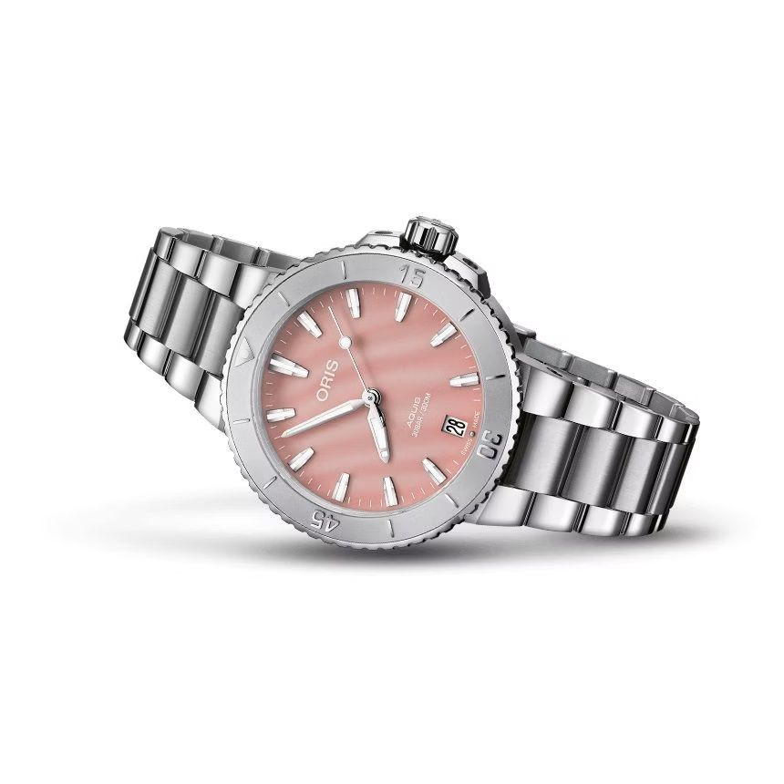 Koperta ze stali nierdzewnej o średnicy 36,5 mm łączy elegancki rozmiar z pełnymi parametrami profesjonalnego zegarka nurkowego. Ceramiczny, jednokierunkowy bezel w kolorze turkusowym, zakręcana koronka, wypukłe szkło szafirowe z wewnętrzną powłoką antyrefleksyjną oraz wodoszczelność na poziomie 300 m (30 bar) gwarantują niezawodność w każdych warunkach. Sercem zegarka jest mechanizm automatyczny Oris 733 (Sellita SW200-1) z funkcją daty na godzinie 6 i rezerwą chodu ok. 38 godzin. Model wyposażono w stalową bransoletę z bezpiecznym zapięciem i systemem mikroregulacji.