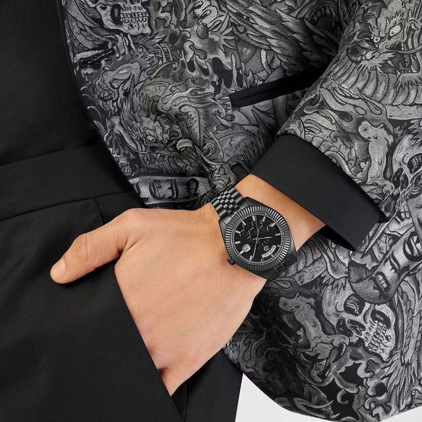 Philipp Plein Date Superlative Gent PWPVA0624 to męski zegarek w stylistyce total black, łączący elegancję czarnej stali szlachetnej z nowoczesnym, modowym charakterem marki Philipp Plein. Jednolita czarna kolorystyka koperty, tarczy oraz bransolety tworzy spójny i wyrazisty design, a subtelne kryształki (rhinestones) nadają modelowi luksusowego, biżuteryjnego akcentu. To zegarek idealny dla mężczyzn ceniących minimalistyczny, lecz efektowny styl.