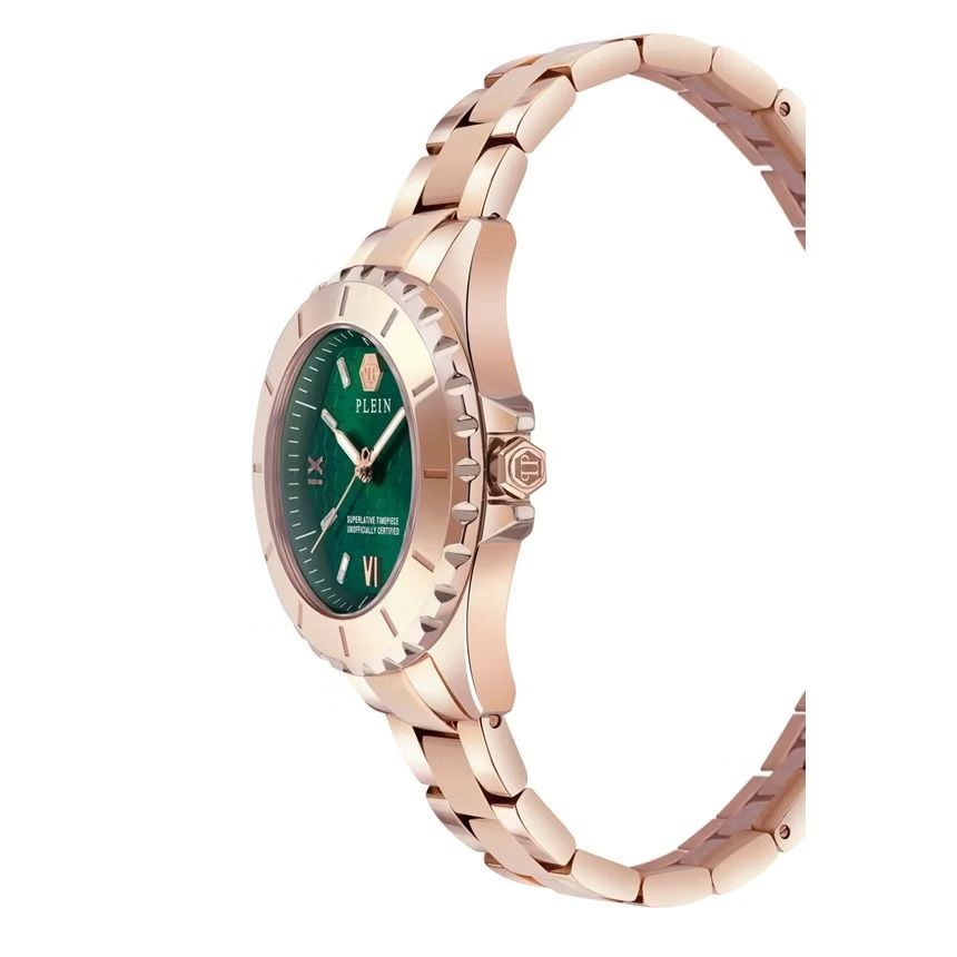 Philipp Plein Heaven Rock Couture PWPOA0824 to damski zegarek biżuteryjno-modowy, który łączy kopertę i bransoletę w kolorze Rosé Gold z efektowną zieloną tarczą oraz błyszczącymi kryształkami. Model wyróżnia się odważnym, a jednocześnie eleganckim designem – zestawienie różowego złota z głęboką zielenią tworzy luksusową i nowoczesną kompozycję idealną dla kobiet lubiących wyraziste dodatki. To zegarek, który pełni funkcję praktycznego czasomierza i stylowej biżuterii jednocześnie.