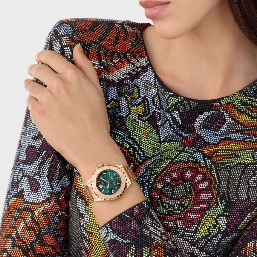 • Kolor Rosé Gold + zielona tarcza – modny i luksusowy kontrast,