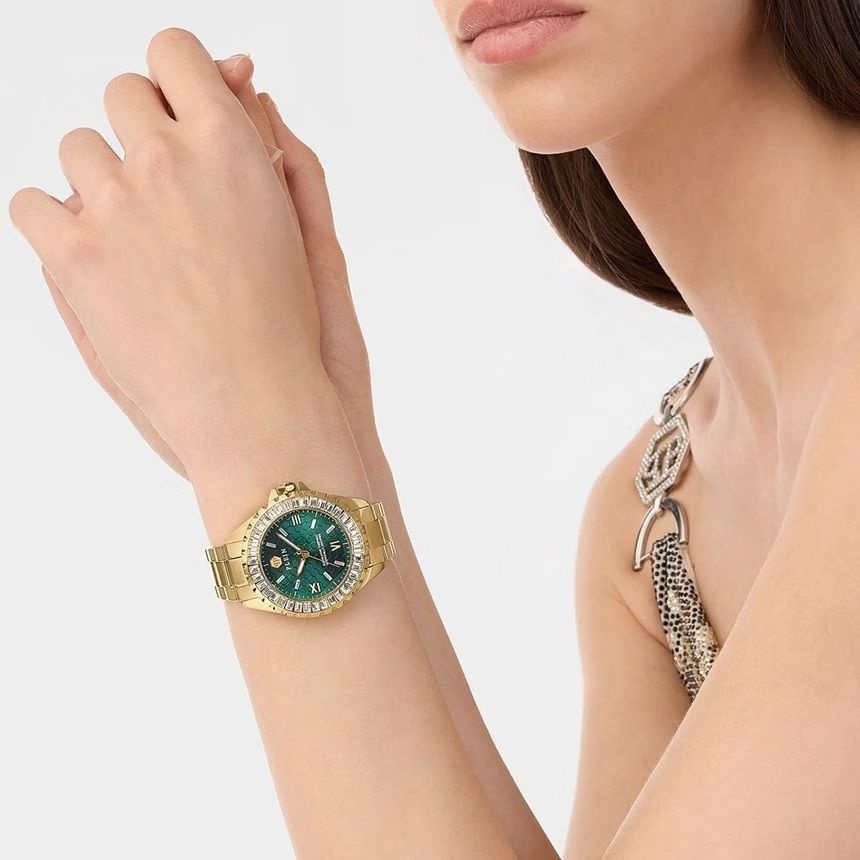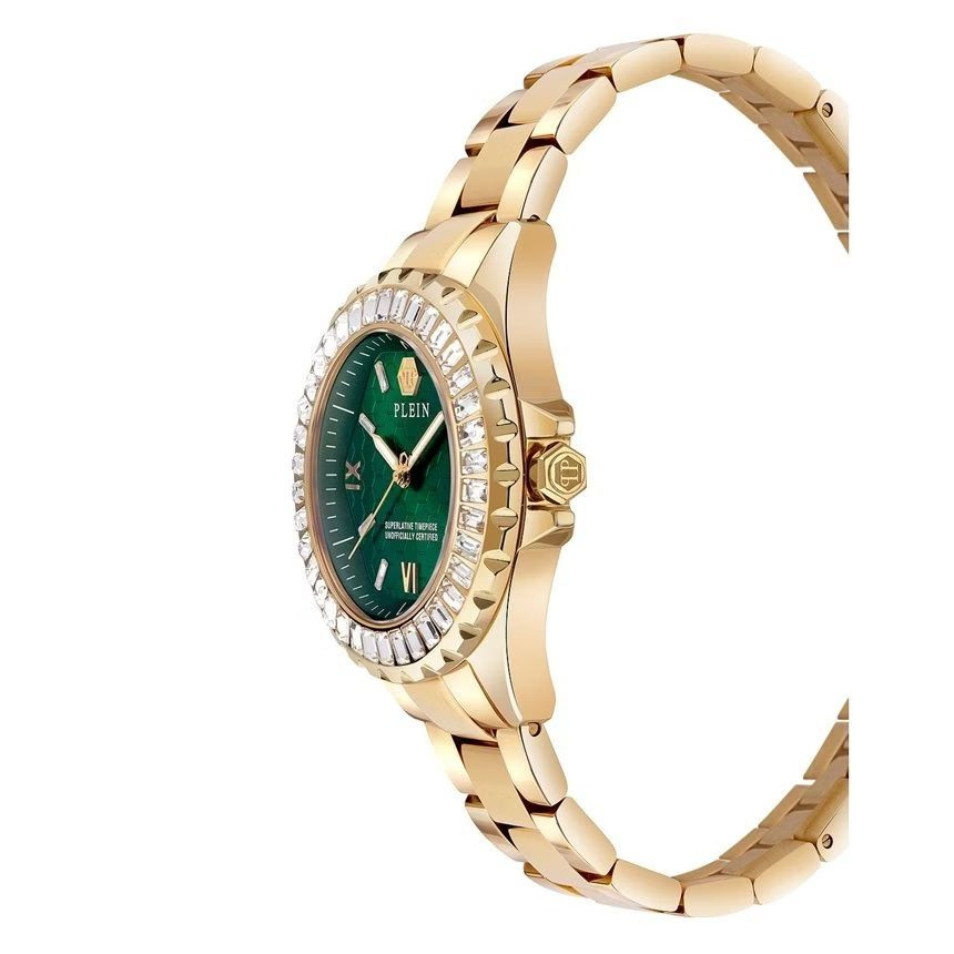 Philipp Plein Heaven Rock Couture PWPOA0924 to damski zegarek biżuteryjno-modowy, który łączy złotą stal szlachetną z głęboką zieloną tarczą oraz błyszczącymi kryształkami, tworząc efektowną i luksusową kompozycję na nadgarstku. Model został zaprojektowany z myślą o kobietach ceniących wyraziste dodatki i modowy charakter premium. Połączenie złota z zielenią nadaje zegarkowi elegancji, świeżości i ponadczasowego stylu, który doskonale sprawdzi się zarówno w stylizacjach dziennych, jak i wieczorowych.