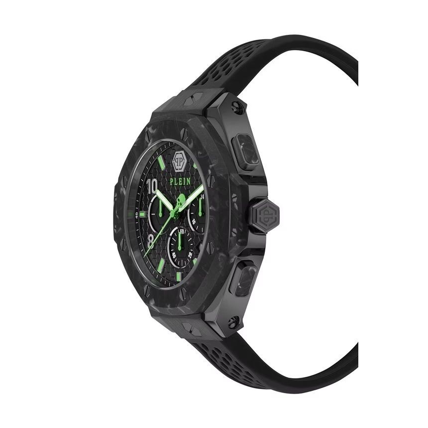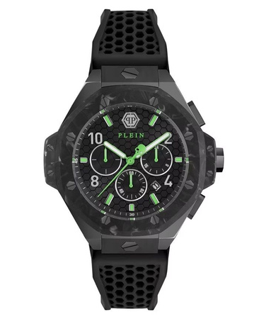 Philipp Plein Hexar Chrono Royal PWPRA0624 to wyrazisty męski zegarek o dynamicznym, sportowym charakterze i modowym wykończeniu premium. Model utrzymany w stylistyce total black został przełamany efektownym detalem w postaci zielonych wskazówek oraz zielonych indeksów, co nadaje mu nowoczesnego i niepowtarzalnego wyglądu. Duża koperta 46 mm oraz funkcja chronografu czynią go idealnym wyborem dla mężczyzn ceniących mocne dodatki.