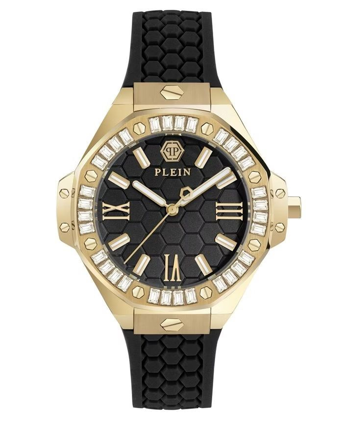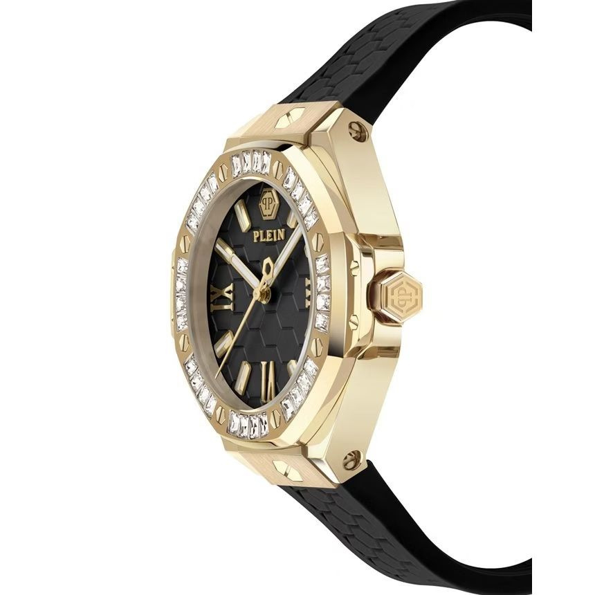 Philipp Plein Lady Royal PWBDA0424 to wyrazisty zegarek o modowym, luksusowym charakterze. Połączenie złotej koperty z czarną tarczą oraz czarnego silikonowego paska tworzy kontrastową i bardzo stylową kompozycję. Cyrkonie dodają biżuteryjnego blasku, dzięki czemu model przyciąga spojrzenia i sprawdza się jako mocny element stylizacji – zarówno dziennej, jak i wieczorowej.