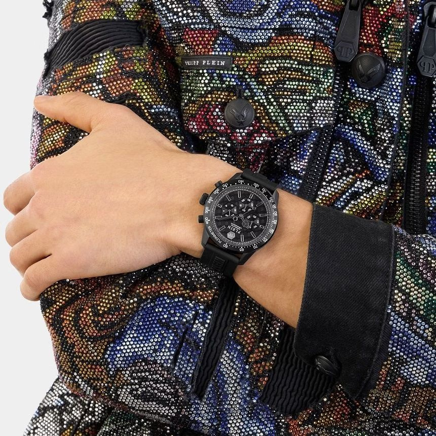 Philipp Plein Pleinmeter Superlative Chrono PWPYA0324 to wyjątkowy męski zegarek łączący sportowy charakter i elegancję. Solidna koperta ze stali szlachetnej w czarnym kolorze o średnicy 44 mm skrywa precyzyjny mechanizm kwarcowy, który napędza funkcje chronografu, sekundnika, minutnika oraz wskazania godzin. Mineralne szkiełko chroni czarną tarczę z efektownymi indeksami i podświetleniem, które gwarantuje czytelność także po zmroku. Zegarek posiada silikonowy pasek w czarnym kolorze, dzięki czemu jest wygodny w codziennym użytkowaniu, a zarazem odporny na warunki atmosferyczne. Pleinmeter Superlative Chrono to połączenie nowoczesnego designu Philipp Plein z funkcjonalnością – idealny wybór dla mężczyzn ceniących styl i wyraziste dodatki. Wodoszczelność 5 ATM sprawia, że zegarek jest odporny na zachlapania i krótkotrwały kontakt z wodą, a solidne zapięcie na sprzączkę gwarantuje pewne trzymanie na nadgarstku. Model dostarczany jest w eleganckim pudełku wraz z kompletem dokumentów.