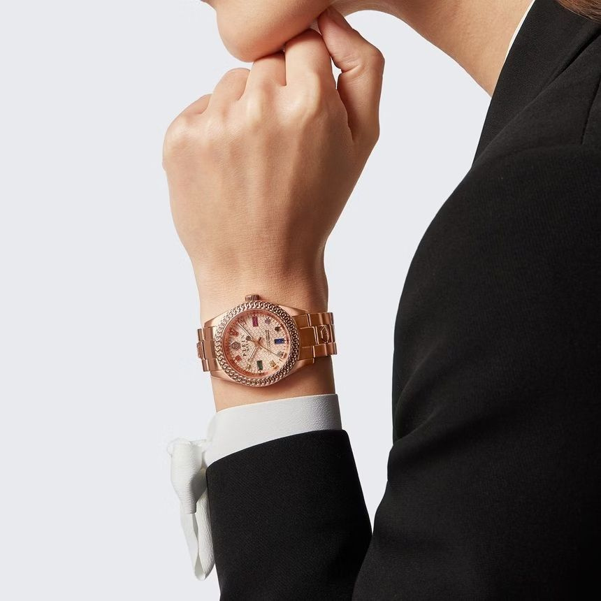 Philipp Plein Queen Crystal PWDAA0821 to luksusowy damski zegarek w kolorze rosé gold, który łączy elegancję i nowoczesny design. Model wyposażony jest w precyzyjny mechanizm kwarcowy oraz analogowy wyświetlacz z trzema wskazówkami – godziną, minutą i sekundą. Koperta zegarka jest okrągła, stalowa w kolorze rosé gold, o średnicy 36 mm i grubości 12 mm, a dekiel stalowy, tłoczony. Szkło mineralne zapewnia odporność na zarysowania, a stały bezel dodaje klasycznego charakteru. Tarcza w kolorze rosé gold ozdobiona jest kryształkami, a luminescencyjne wskazówki ułatwiają odczyt godziny w ciemności. Zegarek posiada stalową bransoletę w kolorze rosé gold o szerokości 20 mm przy uszach, zapięcie typu deployment buckle i dekoracyjne kryształki, które nadają mu wyjątkowego blasku. Model cechuje wodoszczelność 5 ATM, co chroni przed zachlapaniami i krótkotrwałym kontaktem z wodą. W zestawie znajduje się oryginalne pudełko oraz dokumentacja. Philipp Plein Queen Crystal PWDAA0821 to idealny wybór dla kobiet ceniących luksusowe dodatki, elegancję i wysoką jakość wykonania, doskonały zarówno na eleganckie wyjścia, jak i do codziennego noszenia. Słowa kluczowe: Philipp Plein zegarek damski, Philipp Plein Queen Crystal PWDAA0821, luksusowy zegarek damski, zegarek rosé gold, zegarek z kryształkami, analogowy zegarek damski, elegancki zegarek Philipp Plein, damski zegarek kwarcowy.