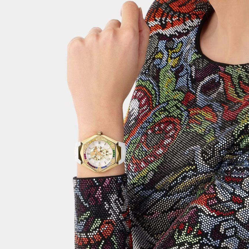 Zegarek Philipp Plein Skull Spikes Lady PWADA0324 to luksusowy damski model, który łączy w sobie biżuteryjny blask i nowoczesny design charakterystyczny dla marki. Ośmiokątna koperta ze stali nierdzewnej w kolorze złotym o średnicy 40 mm i grubości 11 mm przyciąga uwagę odważną formą oraz zdobieniami w postaci błyszczących kryształów na pierścieniu. Srebrna tarcza z wyrazistymi indeksami i wskazówkami pokrytymi warstwą luminescencyjną zapewnia elegancję i czytelność nawet po zmroku. Mineralne szkło chroni cyferblat, a silikonowy pasek w białym kolorze z klasycznym zapięciem na klamrę gwarantuje wygodę noszenia i lekkość. Model napędza niezawodny mechanizm kwarcowy, wskazujący godziny, minuty i sekundy. Wodoszczelność na poziomie 5 ATM sprawia, że zegarek jest odporny na deszcz i zachlapania, co czyni go praktycznym dodatkiem na co dzień. Philipp Plein Skull Spikes Lady PWADA0324 to idealny wybór dla kobiet, które chcą podkreślić swój styl poprzez elegancki, a jednocześnie wyrazisty dodatek o luksusowym charakterze.