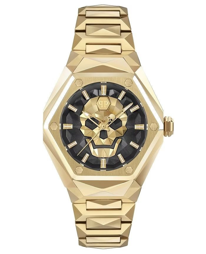 Zegarek Philipp Plein Skull Spikes Lady PWADA0524 to luksusowy damski czasomierz, który doskonale łączy elegancję i wyrazisty charakter marki. Ośmiokątna koperta ze stali nierdzewnej w kolorze złotym o średnicy 40 mm i grubości 11 mm nadaje modelowi unikalny, biżuteryjny wygląd. Czarna tarcza kontrastująca ze złotą kopertą oraz wskazówki i indeksy pokryte powłoką luminescencyjną zapewniają doskonałą czytelność zarówno w dzień, jak i po zmroku. Zegarek wyposażono w mineralne szkło chroniące cyferblat oraz precyzyjny mechanizm kwarcowy, który wskazuje godziny, minuty i sekundy. Całość uzupełnia złota stalowa bransoleta z bezpiecznym zapięciem typu deployment buckle, gwarantująca trwałość i elegancki wygląd. Dzięki wodoszczelności na poziomie 5 ATM zegarek jest odporny na deszcz i zachlapania. Philipp Plein Skull Spikes Lady PWADA0524 to propozycja dla kobiet, które poszukują odważnego dodatku o luksusowym charakterze, idealnie podkreślającego indywidualny styl.