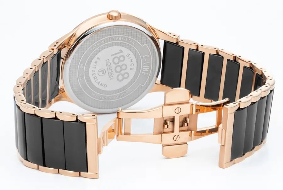 Roamer C-Line Gents 658833-49-35-61 to elegancki męski zegarek szwajcarski, w którym klasyka spotyka się z nowoczesnym wzornictwem. Wyposażony w precyzyjny mechanizm kwarcowy, prezentuje czas z wyjątkową dokładnością. Koperta o średnicy 40 mm w odcieniu różowego złota wykonana jest z wysokiej jakości stali nierdzewnej, a tarczę w kolorze beżowym chroni odporne na zarysowania szafirowe szkło. Wskazówki z powłoką luminescencyjną zapewniają dobrą widoczność w słabszym świetle, a datownik zwiększa funkcjonalność modelu. Bransoleta z ceramiki i stali w dwukolorowym wykończeniu nadaje zegarkowi luksusowy charakter. Wodoszczelność 3 ATM zabezpiecza przed przypadkowymi zachlapaniami. To doskonała propozycja dla mężczyzn ceniących elegancję i wysoką jakość wykonania.