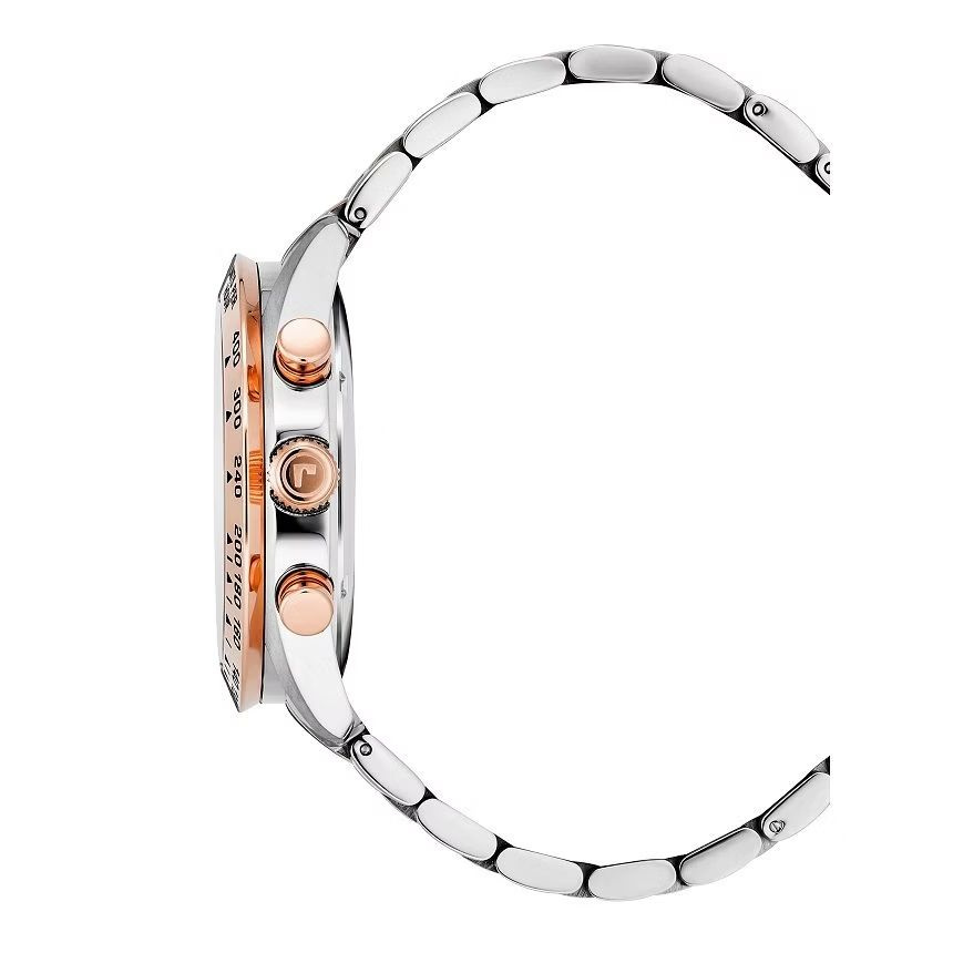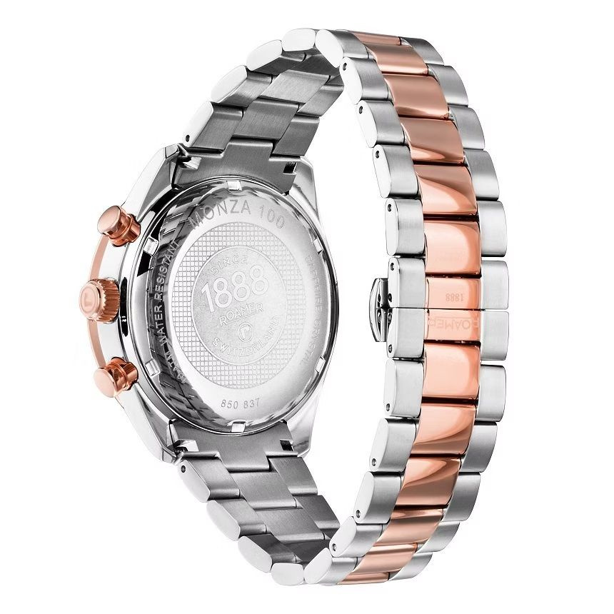Roamer Monza 100 Chrono 850837-49-05-20 to prestiżowy męski zegarek szwajcarski, łączący sportowy charakter z eleganckim wykończeniem. Koperta ze stali szlachetnej o średnicy 42 mm skrywa różowozłotą tarczę z datownikiem oraz funkcją chronografu, która dodaje dynamiki i funkcjonalności. Podświetlane wskazówki i indeksy zapewniają czytelność w każdych warunkach, a szkło szafirowe chroni zegarek przed zarysowaniami. Dwukolorowa stalowa bransoleta z bezpiecznym zapięciem typu deployment podkreśla nowoczesny i luksusowy styl. Model napędzany jest precyzyjnym mechanizmem kwarcowym i oferuje wodoszczelność do 10 ATM, dzięki czemu sprawdzi się zarówno na co dzień, jak i przy bardziej wymagających okazjach.