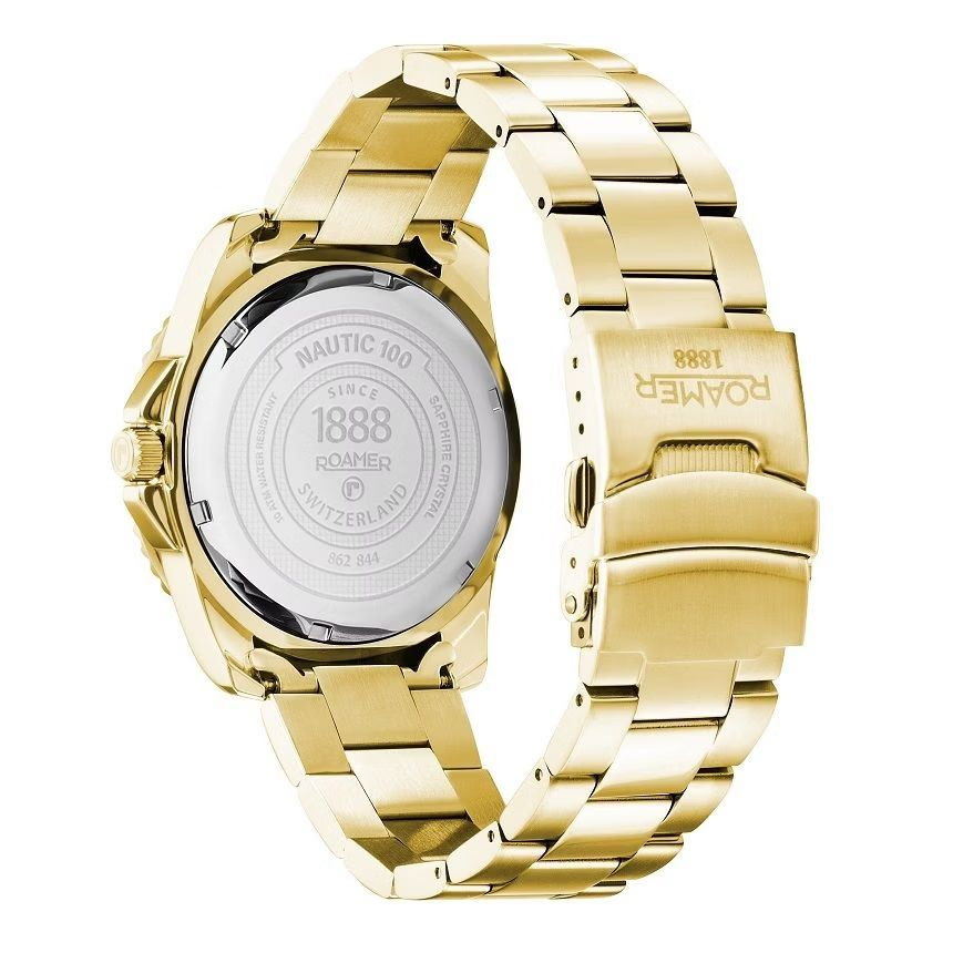 Roamer Nautic 100 862844-48-45-20 to luksusowy męski zegarek szwajcarski, łączący elegancję złotego wykończenia z funkcjonalnością sportowego modelu. Wyposażony w precyzyjny mechanizm kwarcowy, oferuje wskazanie godzin, minut, sekund oraz daty. Solidna koperta o średnicy 43 mm, wykonana ze stali nierdzewnej w złotym kolorze, harmonizuje z głęboką niebieską tarczą, na której znajdują się podświetlane wskazówki zapewniające czytelność w każdych warunkach. Szafirowe szkło chroni cyferblat przed zarysowaniami, a złota stalowa bransoleta z bezpiecznym zapięciem typu deployment podkreśla prestiżowy charakter zegarka. Wodoszczelność 10 ATM umożliwia pływanie i codzienne użytkowanie bez obaw o uszkodzenie.