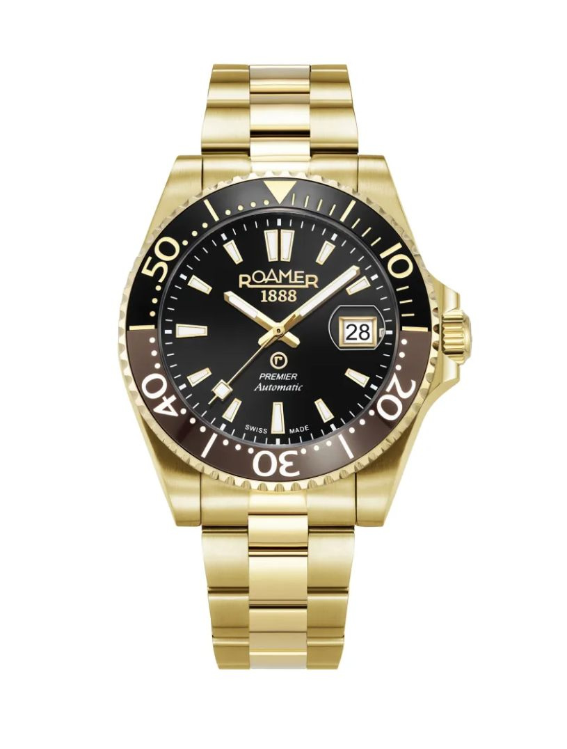 Roamer Premier Automatic 986983-48-85-20 to elegancki męski zegarek automatyczny, który łączy sportową funkcjonalność z wyrafinowanym designem. Koperta o średnicy 42 mm wykonana jest ze stali nierdzewnej pokrytej powłoką PVD w kolorze złota, a tarczę chroni odporne na zarysowania szkło szafirowe. Czarna tarcza posiada powiększone okienko daty na godzinie trzeciej, złocone luminescencyjne indeksy i wskazówki zapewniające doskonałą czytelność również w słabszym świetle. Obrotowy bezel w kolorze czarno-brązowo-złotym podkreśla charakter modelu inspirowanego stylistyką zegarków nurkowych. Wewnątrz pracuje szwajcarski mechanizm automatyczny Soprod P24 z rezerwą chodu około 44 godzin, widoczny przez przeszklony dekiel. Bransoleta ze stali nierdzewnej pokrytej złotym PVD wyposażona jest w zapięcie motylkowe. Wodoodporność na poziomie 20 ATM (200 m) pozwala na pływanie i nurkowanie rekreacyjne.