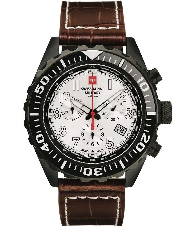 Swiss Alpine Military Navy Chrono SAM7076.9572 to męski zegarek szwajcarski łączący sportowy charakter z elegancją. Wyposażony w precyzyjny mechanizm kwarcowy Ronda 5030.D Swiss Made oferuje funkcje chronografu, datownika oraz dokładny pomiar godzin, minut i sekund. Solidna stalowa koperta w czarnym kolorze o średnicy 46 mm i grubości 11 mm gwarantuje trwałość, a mineralne szkło chroni srebrną tarczę z luminescencyjnymi wskazówkami. Model posiada brązowy pasek skórzany zapinany na klasyczną sprzączkę, wodoodporność 10 ATM oraz zakręcany dekiel ze stali nierdzewnej. To propozycja dla mężczyzn ceniących szwajcarską jakość, funkcjonalność i stylowy design w przystępnej cenie.