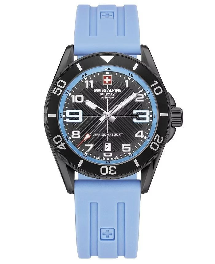 Swiss Alpine Military Raptor SAM7029.1871, zegarek męski, Swiss Made, mechanizm kwarcowy Ronda 515 H, stal nierdzewna, koperta 42 mm, czarna koperta, mineralne szkło, tarcza czarna, silikonowy pasek światłoniebieski, zapięcie typu pin buckle, wodoszczelność 10 ATM (100 m), analogowy wyświetlacz, datownik, indeksy i wskazówki z luminacją, styl sportowo-casual, zegarek codzienny, solidne wykonanie.