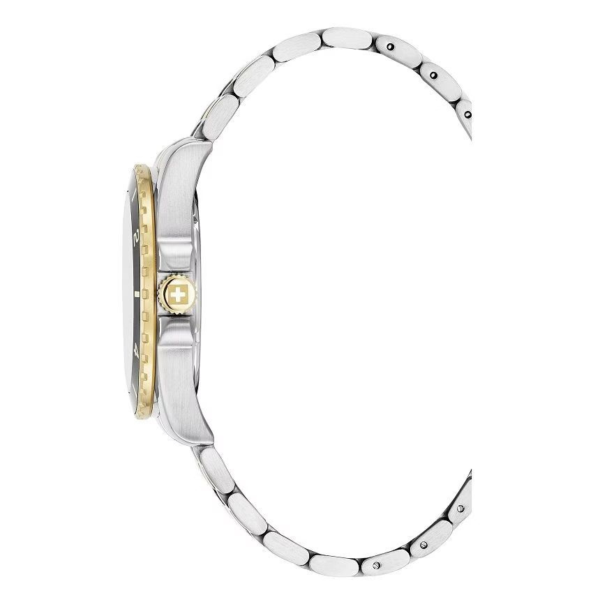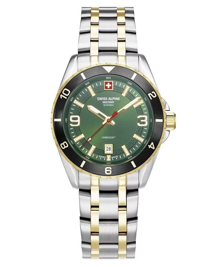 Swiss Alpine Military Sierra SAM7034.1148, zegarek męski, Swiss Made, mechanizm kwarcowy Ronda 515 H, stal nierdzewna, koperta srebrna 42 mm, grubość 11 mm, mineralne szkło, zielona tarcza, bransoleta bicolor stalowa, deployment buckle, datownik, luminous hands, luminous indices, wodoszczelność 10 ATM, elegancki zegarek męski, sportowo-casualowy styl, solidny szwajcarski zegarek