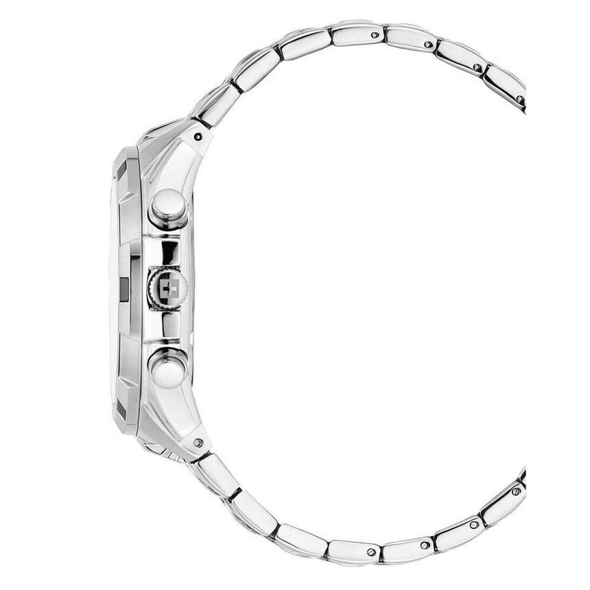 Koperta ze stali nierdzewnej o średnicy 42 mm i grubości 12 mm zapewnia trwałość, a szafirowe szkło chroni czarną tarczę przed zarysowaniami. Lśniące srebrne indeksy oraz podświetlane wskazówki gwarantują doskonałą czytelność, także w ciemności. Model został uzupełniony stalową bransoletą z bezpiecznym zapięciem typu deployment, która nadaje mu elegancko-sportowy charakter.