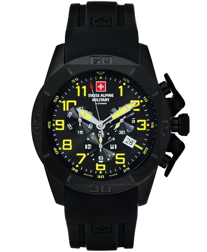 Zegarek Swiss Alpine Military Tornado Chrono SAM7063.9874 to solidny męski czasomierz stworzony z myślą o dynamicznym stylu życia i nowoczesnym designie. Wyposażony jest w precyzyjny szwajcarski mechanizm kwarcowy Ronda 5030.D Swiss Made, który oferuje wskazania godzin, minut i sekund, datownik oraz funkcję chronografu. Koperta o średnicy 45 mm i grubości 12 mm wykonana została ze stali nierdzewnej w czarnym kolorze, co nadaje zegarkowi mocny i sportowy wygląd. Czarna tarcza z wyraźnymi indeksami i wskazówkami pokrytymi warstwą luminescencyjną zapewnia doskonałą czytelność zarówno w dzień, jak i w nocy. Mineralne szkło chroni zegarek przed uszkodzeniami, a zakręcany dekiel wzmacnia konstrukcję. Wodoszczelność 10 ATM pozwala swobodnie korzystać z zegarka podczas pływania i codziennego użytkowania. Model uzupełnia czarny silikonowy pasek o szerokości 24 mm, zakończony klasyczną sprzączką, który gwarantuje wygodę noszenia i podkreśla sportowy charakter zegarka. Swiss Alpine Military Tornado Chrono SAM7063.9874 to propozycja dla mężczyzn ceniących szwajcarską jakość, praktyczne funkcje i wyrazisty styl.