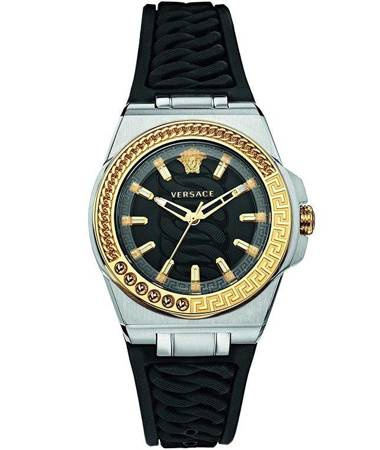 • Tarcza: Zegarek posiada czarną tarczę, która kontrastuje z srebrną kopertą i gumowym paskiem, zapewniając doskonałą czytelność. Na tarczy znajdują się połyskujące wskazówki oraz indeksy, a na godzinie 12 umieszczono charakterystyczne logo marki – głowa Meduzy, co jest jednym z najbardziej rozpoznawalnych symboli Versace.