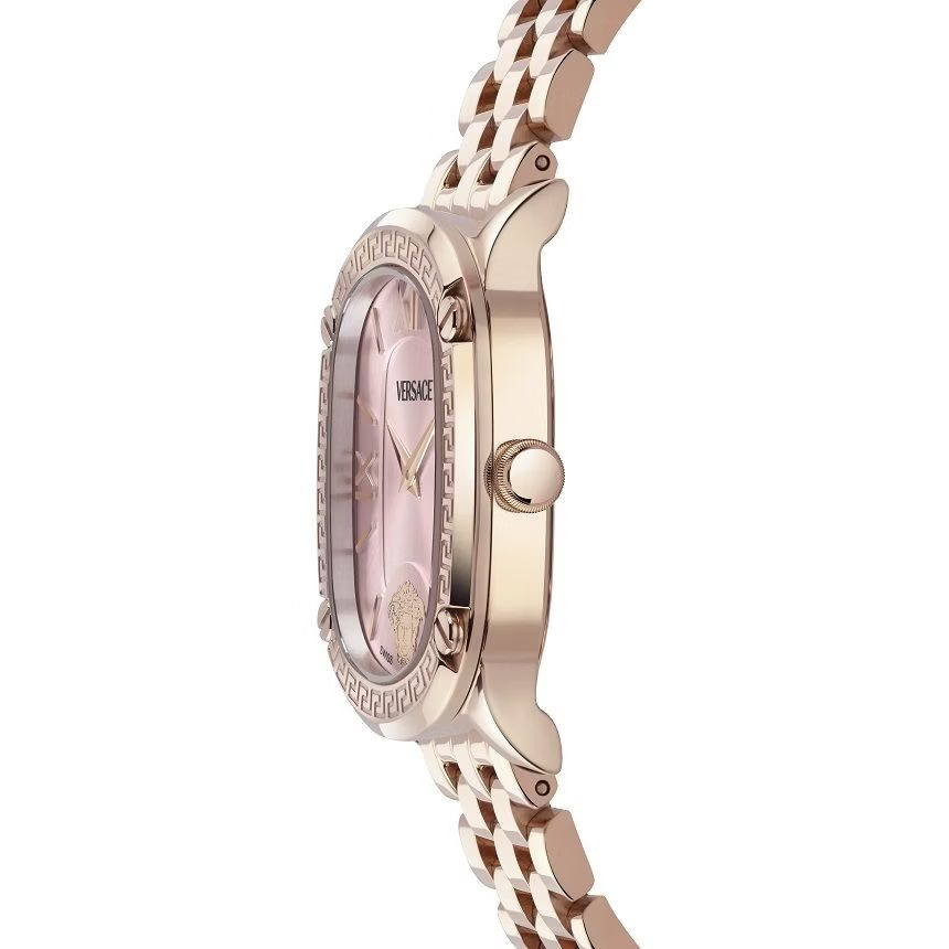 Smukła owalna koperta o szerokości 29 mm w kolorze rose gold idealnie komponuje się z subtelną jasnoróżową tarczą, tworząc harmonijną, niezwykle kobiecą całość. Charakterystyczny motyw Greca nadaje zegarkowi rozpoznawalnego, luksusowego charakteru. Szafirowe szkło zapewnia wysoką odporność na zarysowania, a precyzyjny mechanizm kwarcowy gwarantuje niezawodność i komfort użytkowania.