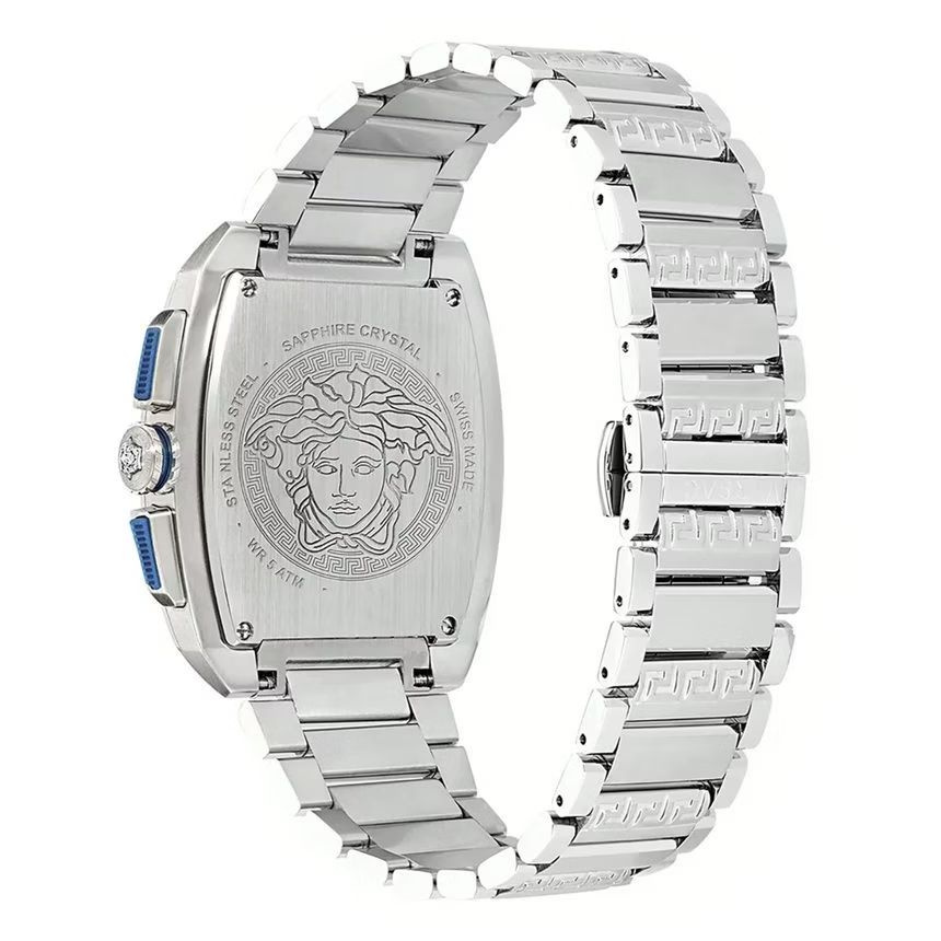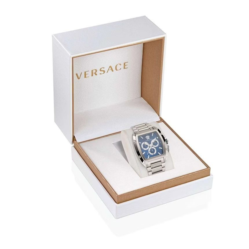 Versace Dominus Chrono VE6H00423 to wyrazisty, luksusowy zegarek męski, który łączy sportową funkcjonalność chronografu z charakterystycznym, modowym DNA marki Versace. Model wyróżnia się kopertą typu tonneau, dynamiczną niebieską tarczą oraz masywną stalową bransoletą, tworząc nowoczesny zegarek klasy luxury sport.