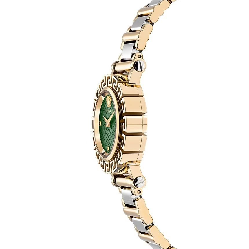 Złota koperta o średnicy 30 mm, wykonana ze stali szlachetnej, idealnie komponuje się z efektowną zieloną tarczą, nadając zegarkowi charakteru i głębi. Motywy inspirowane kolekcją Greca Couture subtelnie nawiązują do dziedzictwa włoskiego domu mody, czyniąc ten model rozpoznawalnym i prestiżowym dodatkiem.