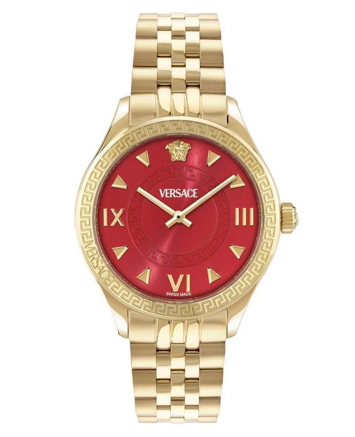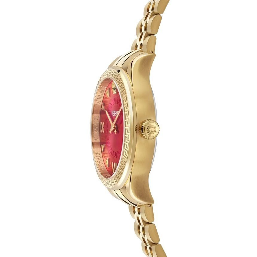 Zegarek Versace Hellenyium Lady VE2S01325 to najbardziej wyrazista odsłona linii Hellenyium. Intensywnie czerwona tarcza w połączeniu z złotą kopertą i bransoletą ze stali nierdzewnej tworzy luksusowy, zmysłowy efekt inspirowany włoskim stylem i kobiecą siłą. To model, który nie jest jedynie dodatkiem – on buduje stylizację.
