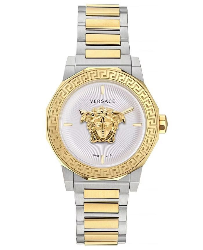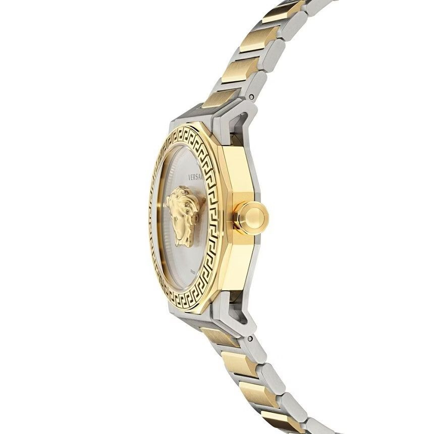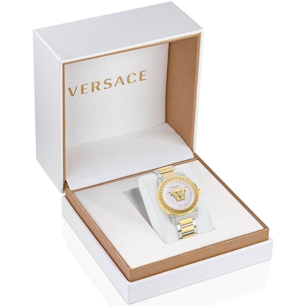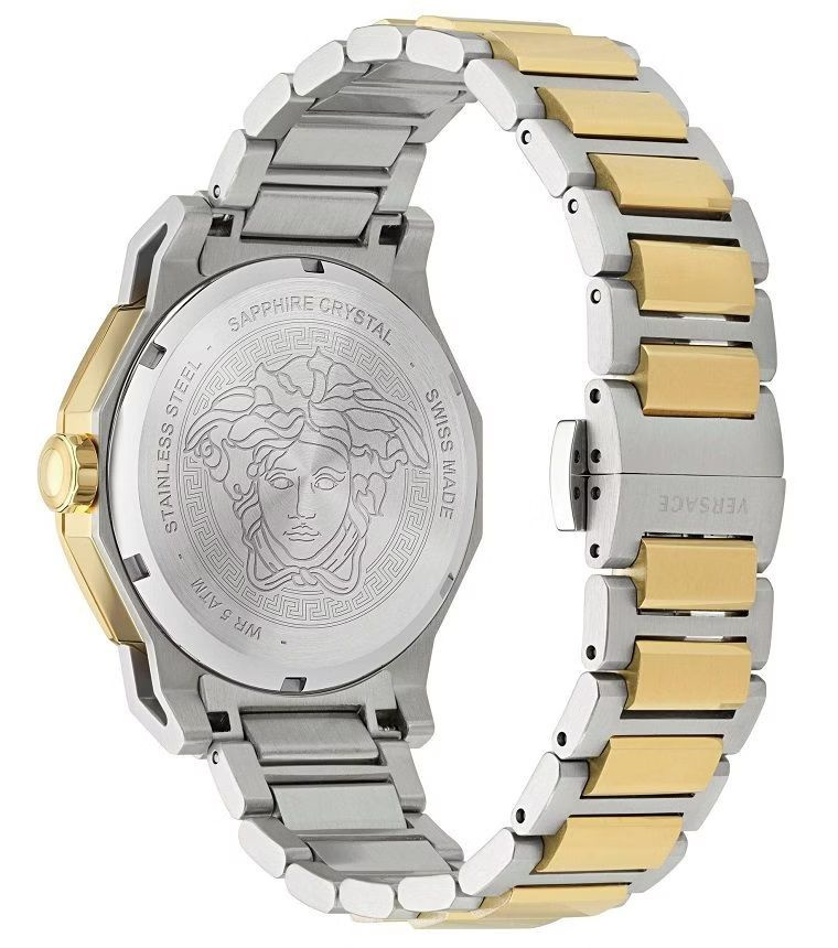 Koperta: Ośmiokątna, wykonana ze stali nierdzewnej z wyrazistym złotym wykończeniem. Obrzeże zdobi charakterystyczny grecki motyw Meander – znak rozpoznawczy marki Versace.