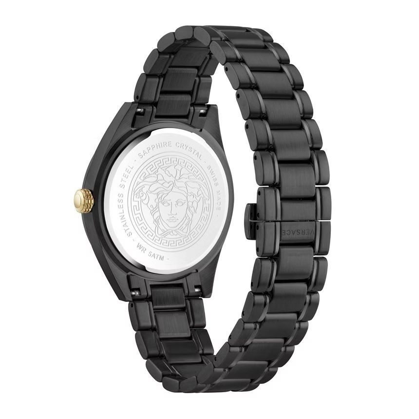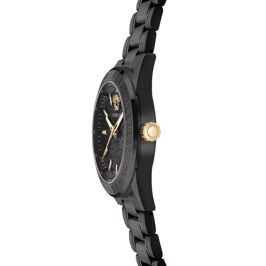 Zegarek Versace V-Code Gents VE6A00825 w czarnej odsłonie to propozycja dla mężczyzn, którzy cenią minimalizm, zdecydowany styl i luksusowy charakter. Połączenie czarnej tarczy, czarnej koperty oraz stalowej bransolety w czarnym wykończeniu tworzy nowoczesny, spójny design typu total black, który doskonale wpisuje się we współczesną elegancję.