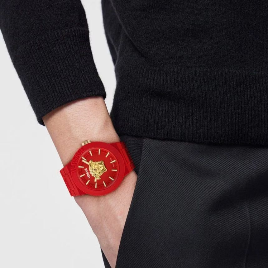 ZEGAREK VERSACE V-Pop VEEFA0124 to męski model z kolekcji V-Pop, charakteryzujący się analogowym wyświetlaczem i kwarcowym mechanizmem zasilanym baterią. Posiada szafirowe szkło, okrągłą kopertę wykonaną z plastiku w czerwonym kolorze o szerokości 43 mm, z zakręcanym stalowym deklem. Tarcza zegarka jest również czerwona, a wskazówki oraz indeksy są podświetlane. Zegarek wyposażony jest w silikonowy pasek w tym samym kolorze co koperta, zapinany na tradycyjną klamrę typu pin buckle. Wodoszczelność wynosi 3 ATM, co oznacza odporność na przypadkowe zachlapanie (do 30 metrów).