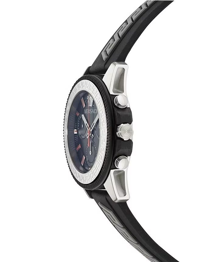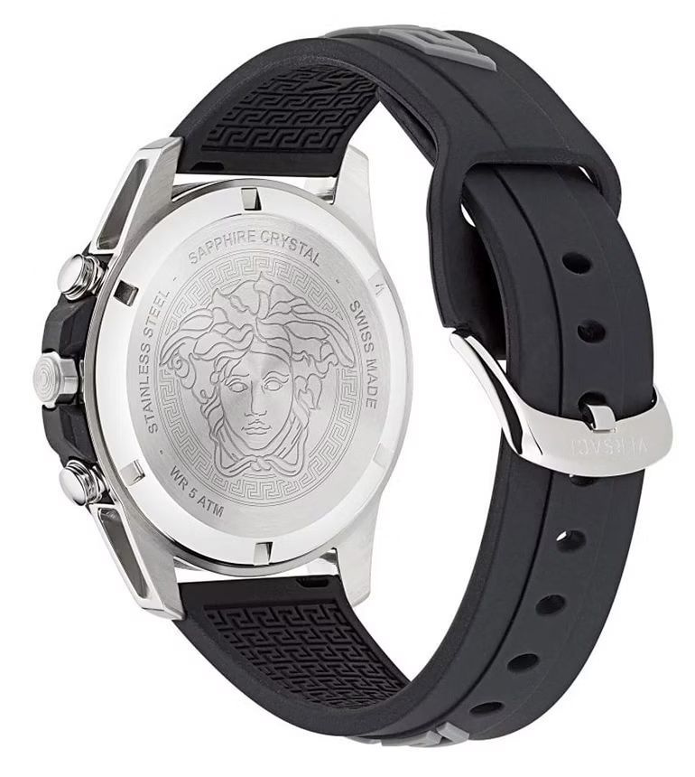 Zegarek VERSACE VE3J00222 to niezwykły , męski czasomierz , który będzie doskonałym dodatkiem do eleganckiego jak i codziennego ubioru każdego mężczyzny. Mając taki zegarek w swojej kolekcji można być pewnym, że posiada się rzecz luksusową , wyjątkową i ekstrawagancką. Czasomierz posiada praktyczny i wygodny w noszeniu gumowy pasek w kolorze czarnym , na którym umocowano srebrną kopertę a wewnątrz niej czytelną, czarną tarczę. Umieszczono na niej wskazówki oraz indeksy pokryte powłoką świecącą. Całość przykryta jest szkiełkiem szafirowym, które bardzo dobrze znosi nawet najtwardsze rodzaje zarysowań. Zegarek działa w oparciu o precyzyjny mechanizm kwarcowy z funkcją datownika i chronografu. Wodoszczelność została ustalona w klasie 5ATM (WR50m) , co daje możliwość jedynie przypadkowego kontaktu z wodą. Zegarek nie jest odporny na pełne zanurzenie. Produkt jest nowy, w pełni oryginalny, objęty ochroną gwarancyjną sklepu. Do każdego czasomierza dołączona jest instrukcja, pudełko i dokumenty świadczące o oryginalności produktu.